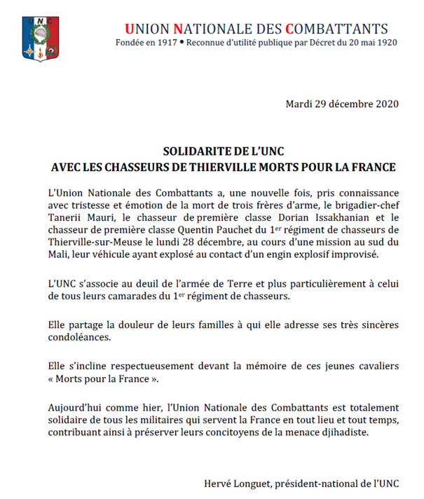 Nous nous associons tous à la douleur des familles, des proches et des compagnons d’armes.