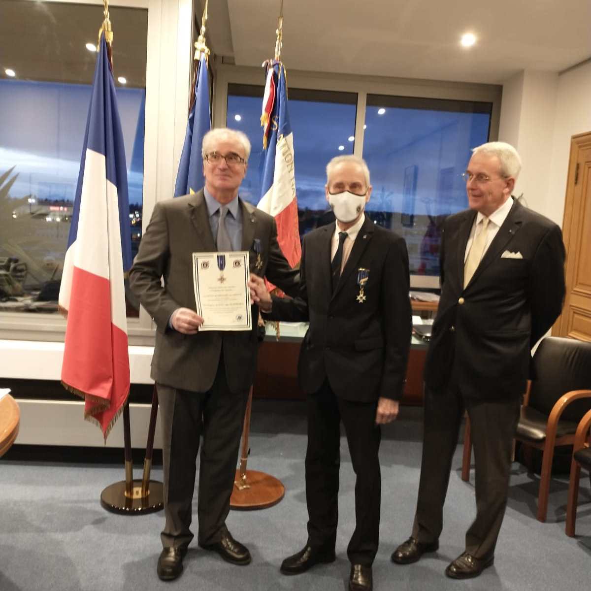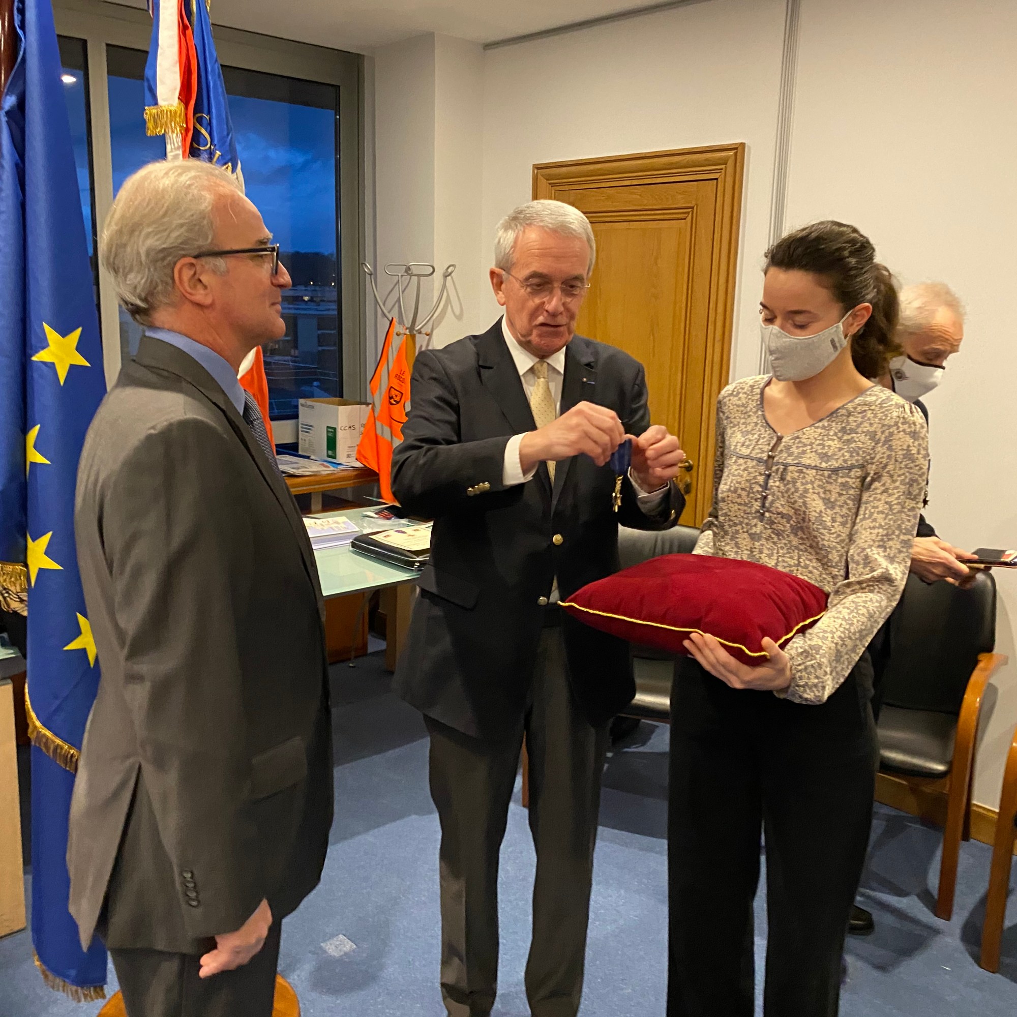 C’est le mardi 29 décembre 2020 que la cérémonie de remise de la Croix du Mérite promotion « Charles de Gaulle 2020 » se déroula dans le bureau de Monsieur Richard Delpierrele Maire du Chesnay Rocquencourt. Pour dix ans d’activités au sein de l’Association Monsieur Tanneguy Audic de Kernen fut honoré de la Croix du Mérite des Mémoires du Mont-Valérien remise par le Président Alain FABER en présence du Secrétaire Général Exécutif Patrick Ourceyre. Une représentaion fort réstreinte familiale et amicale fut invitée. Nous remercions Monsieur Richard Delpierre Maire du Chesnay Rocquencourt pour son acceuil chaleureux.