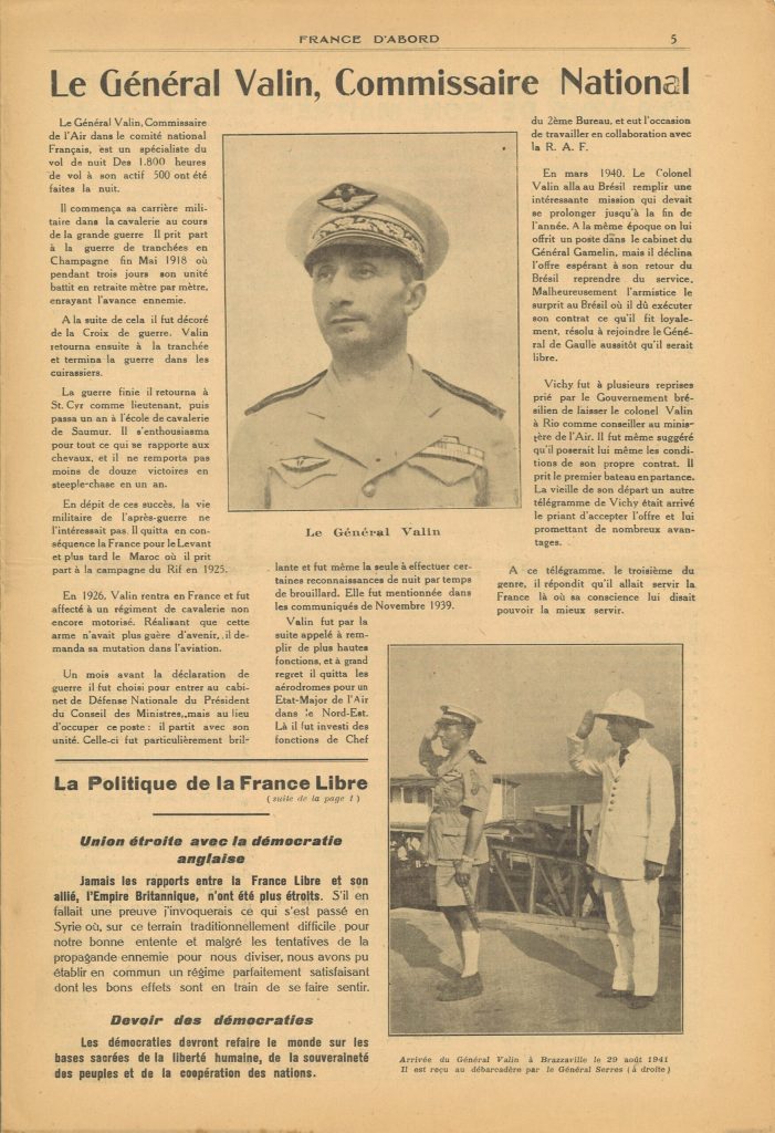 Dès l été 1940, la France Libre compte dans ses rangs des Limousins. Parmi eux, une figure limougeaude : Martial Valin, chef d état-malor de l Air des forces françaises libres. Lancien élève de Gay-lussac, alors âgé de 42 ans, a choisi l aviation depuis 1926…Promu au commandement en 1936, il conduit durant la terrible bataille de 1940 la 33ème escadre aérienne. La défaite stimule Martial Valin. Vichy a beau le condamner à mort, le limougeaud met le cap vers Londres. Il va faire partie du cercle le plus proche des conseillers du chef de la France Libre. Lorsque les relations diplomatiques sont rompues entre Pétain et l Union soviétique, le Général de Gaulle s’engouffre dans la brèche. Désireux de ne pas être lié uniquement aux Anglais et aux Américains, de Gaulle choisit aussi de se rapprocher des Russes. En février 1942, le Général Valin engage des négociations avec la mission soviétique à Londres.