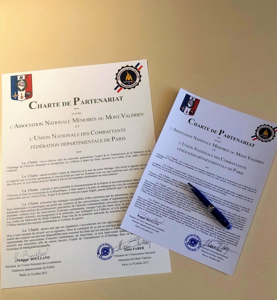 Ce jour le 29 juillet 2021 à 11h00, au siège de l’Union Nationale des Combattants Fédération Départementale de Paris et sous le regard très bien veillant du Père BROTTIER que fut signé par les Présidents Alain FABER des Mémoires du Mont-Valérien et Philippe BOULLAND, de l’Union Nationale des Combattants Fédération Départementale de Paris, la « Charte de Partenariat » permettant une étroite coopération entre les deux associations. Chacune gardant sont indépendance et sa spécificité.