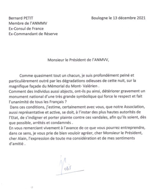 A vous, Président national des Mémoires du Mont Valérien, je tiens à témoigner ma condamnation à l’encontre de ceux qui ont souillé ce monument symbolisant le Courage et honorant la Mémoire de Français qui firent don de leur vie pour défendre la Liberté.