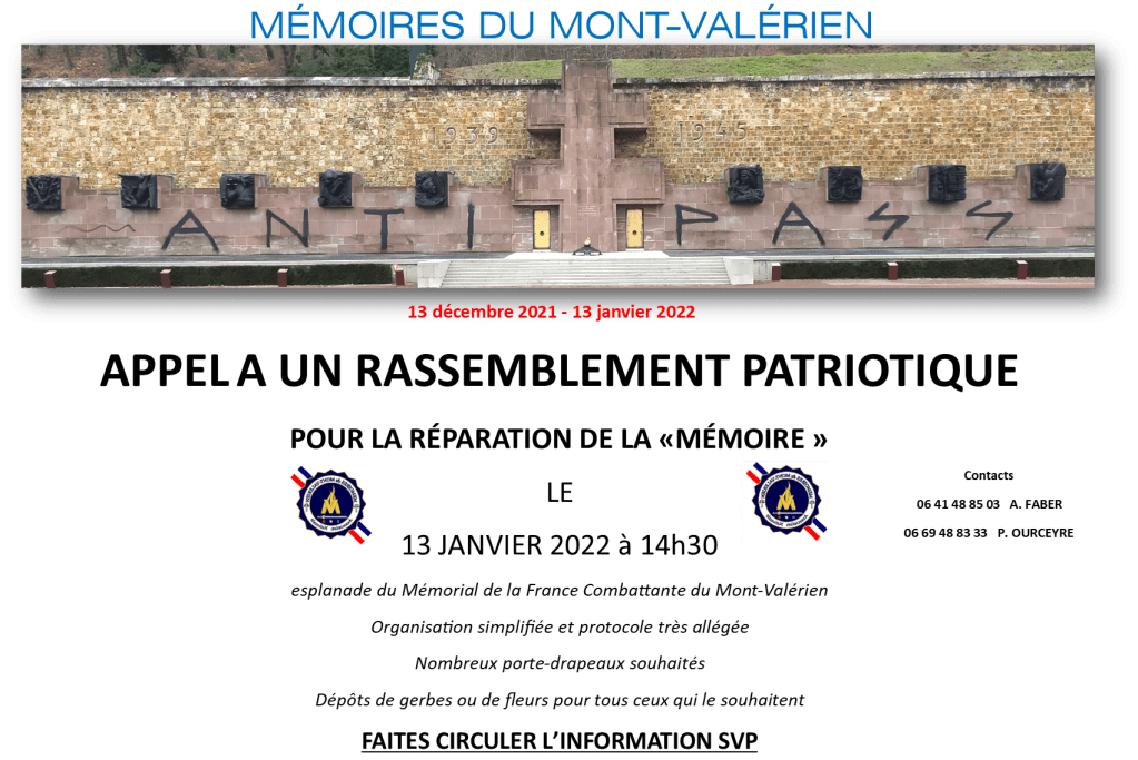 Entretenir et faire respecter la MÉMOIRE du MONT-VALÉRIEN, promouvoir et développer la mémoire par la communication, le dialogue et par une relation intergénérationnelle permanente en France et à l’étranger.