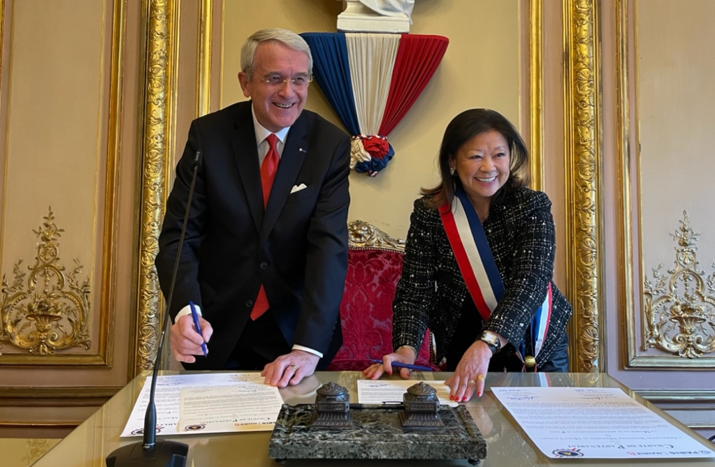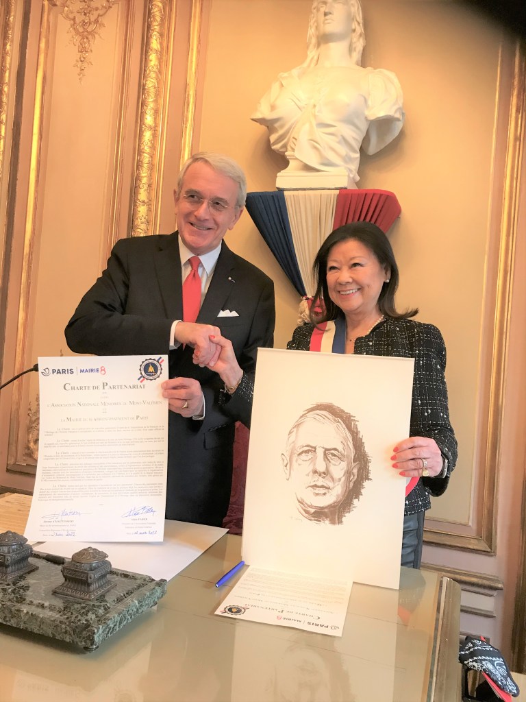 Signature à Paris de la « Charte de Partenariat » rapprochant l’Association Nationale des Mémoires du Mont-Valérien et la Mairie du 8è arrondissement de Paris, par Madame le Maire Jeanne d’Hauteserre et Monsieur Alain Faber Président des Mémoires du Mont-Valérien.