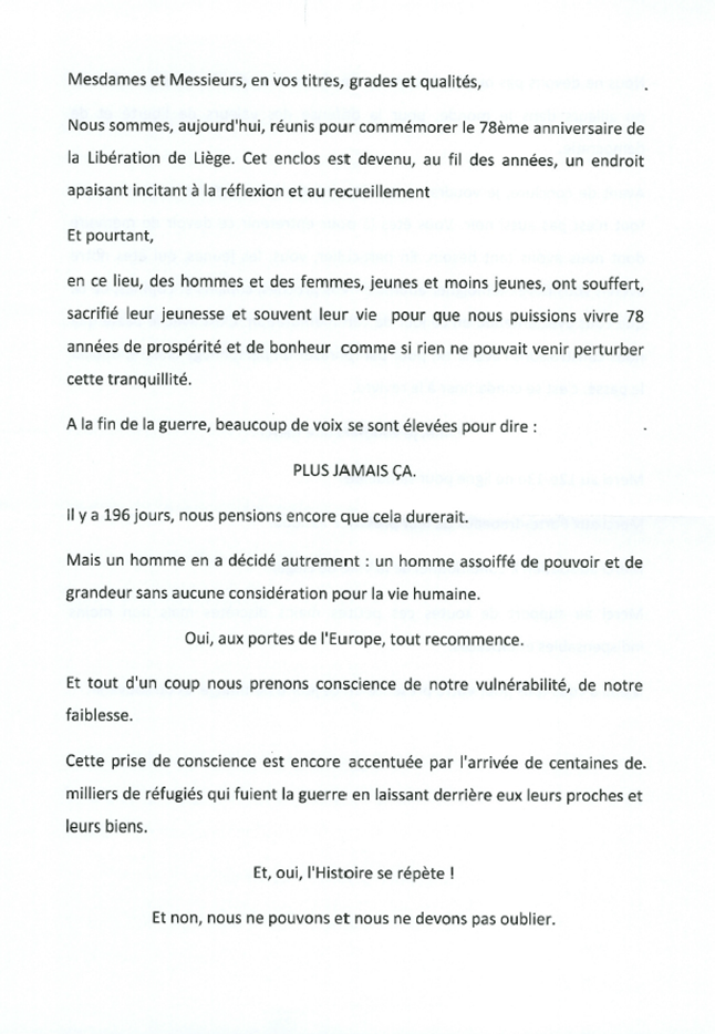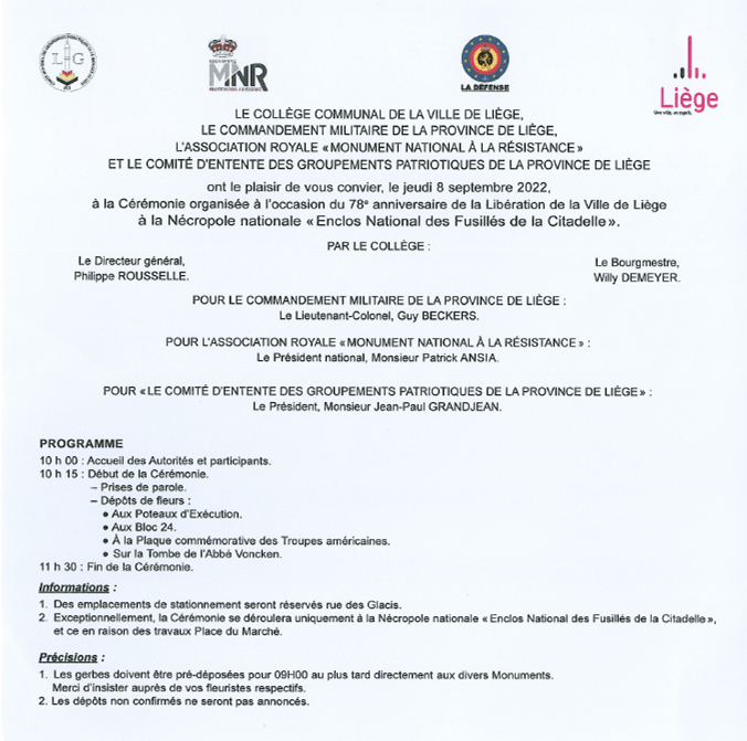 Dans le cadre des relations européennes de notre association celle-ci fut invitée à participer à la cérémonie du 78ème anniversaire de la Libération de la Province de LIÈGE.