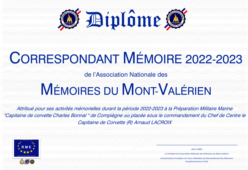 Nous félicitons le CENTRE DE PRÉPARATION MILITAIRE MARINE » Capitaine de corvette Charles Bonnal » de Compiègne pour la qualité de son instruction et son ouverture à la mémoire de nos anciens. Nous sommes heureux que celui-ci soit devenue « Correspondant Mémoire » pour ses nombreuses activités mémorielles transmises aux stagiaires.