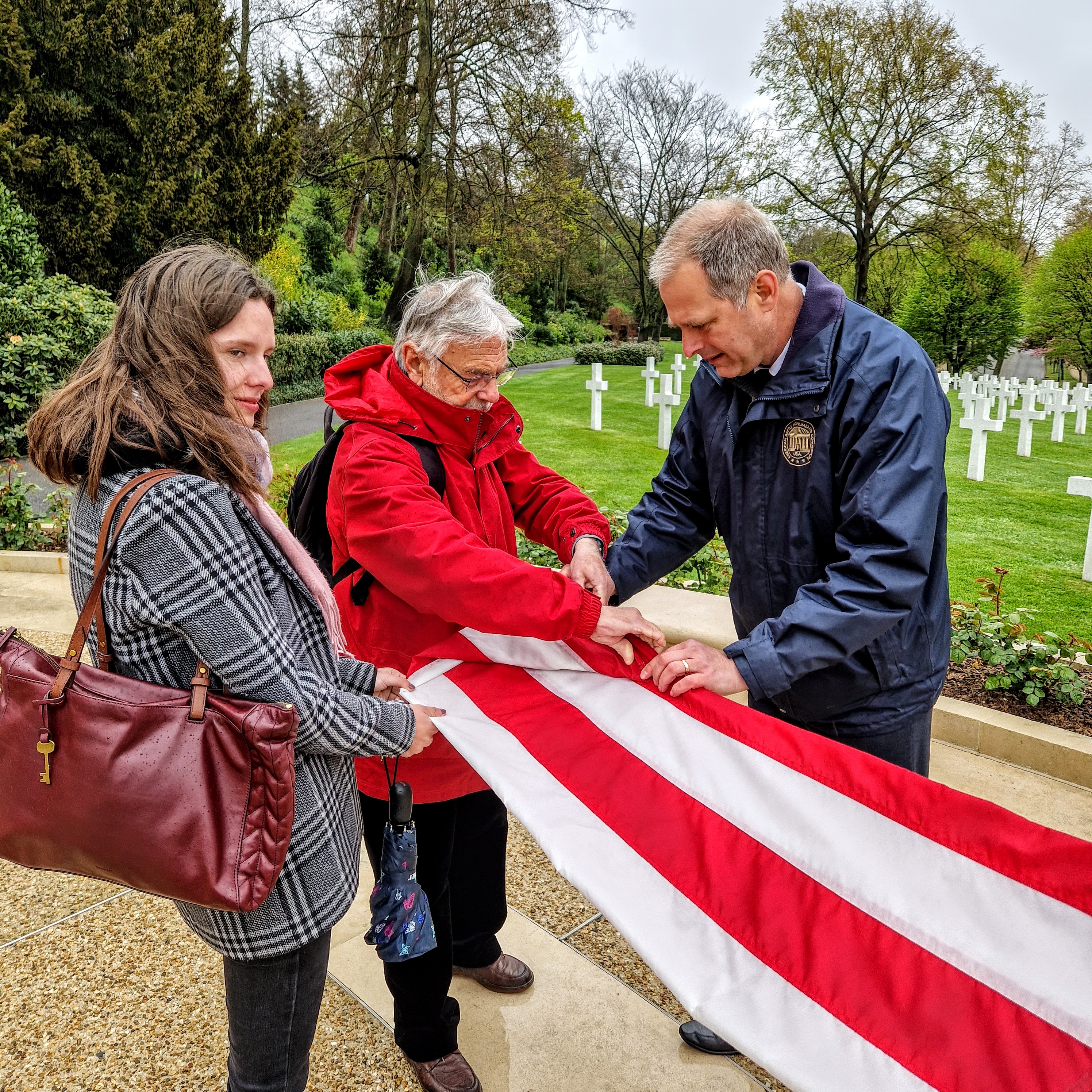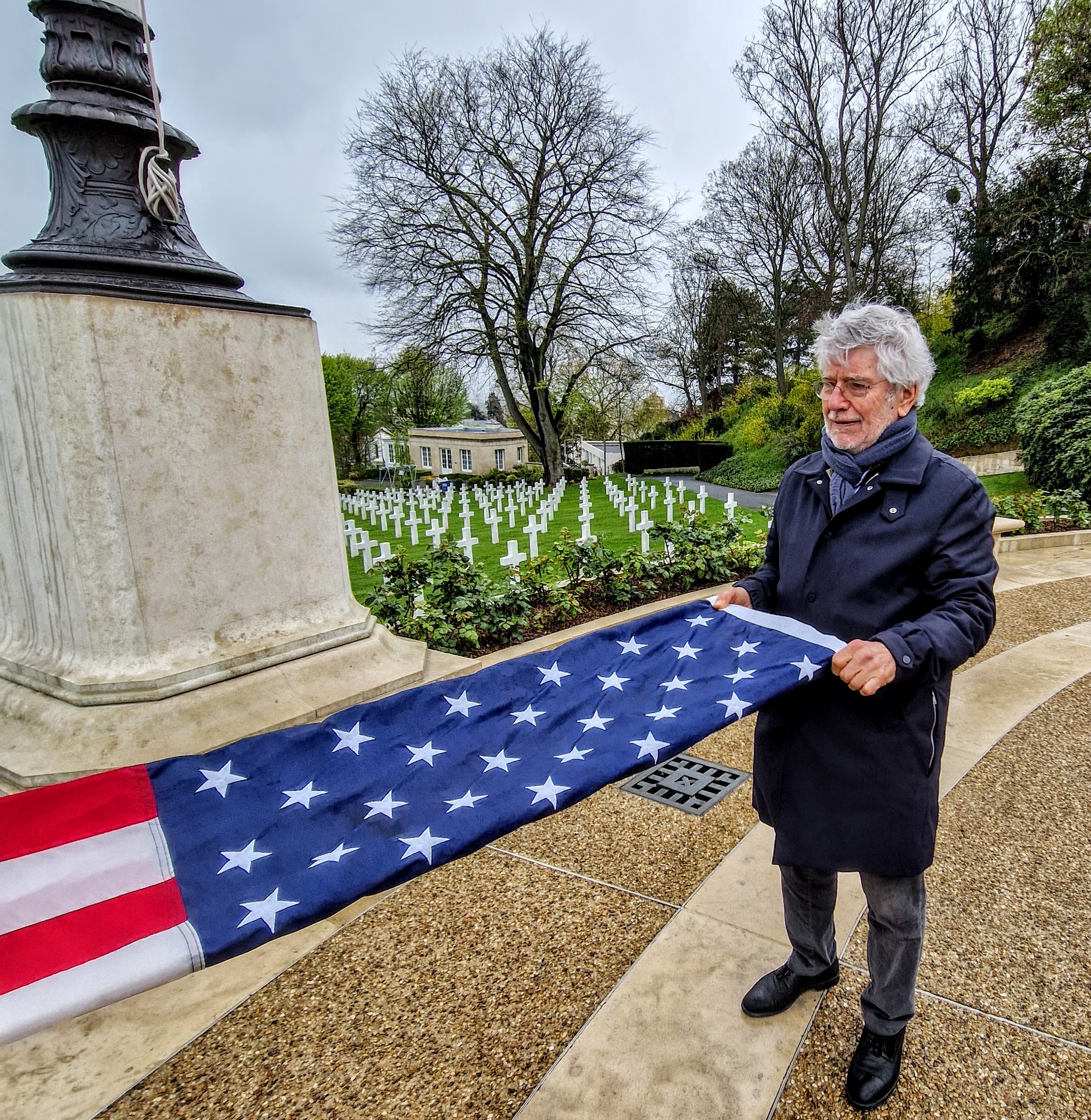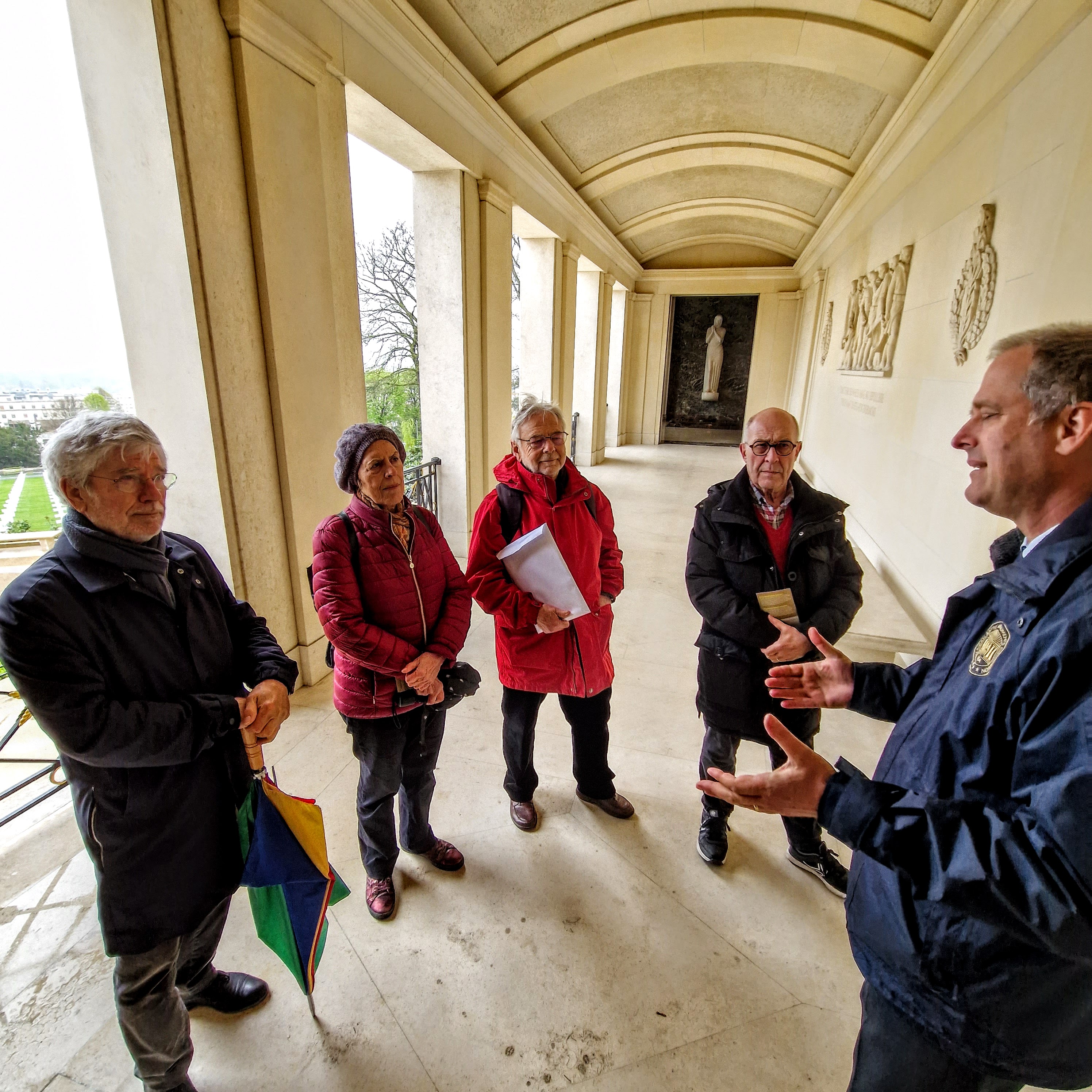 La visite de l’ensemble du site fut conduite par notre président Alain FABER et se poursuivit par un accueil au cimetière américain de Suresnes ou nos amis furent reçus par Monsieur le Surintendant Keith Stadler. Celui-ci après avoir développé l’histoire de ce lieu de repos éternel et de la mémoire américaine lors des guerres de 14-18 et 39-45 proposa à nos amis pour clore cette journée préparatrice de leur prochaine venue en groupe, de les faire participer à la descente des couleurs américaines et aux pliages des drapeaux.