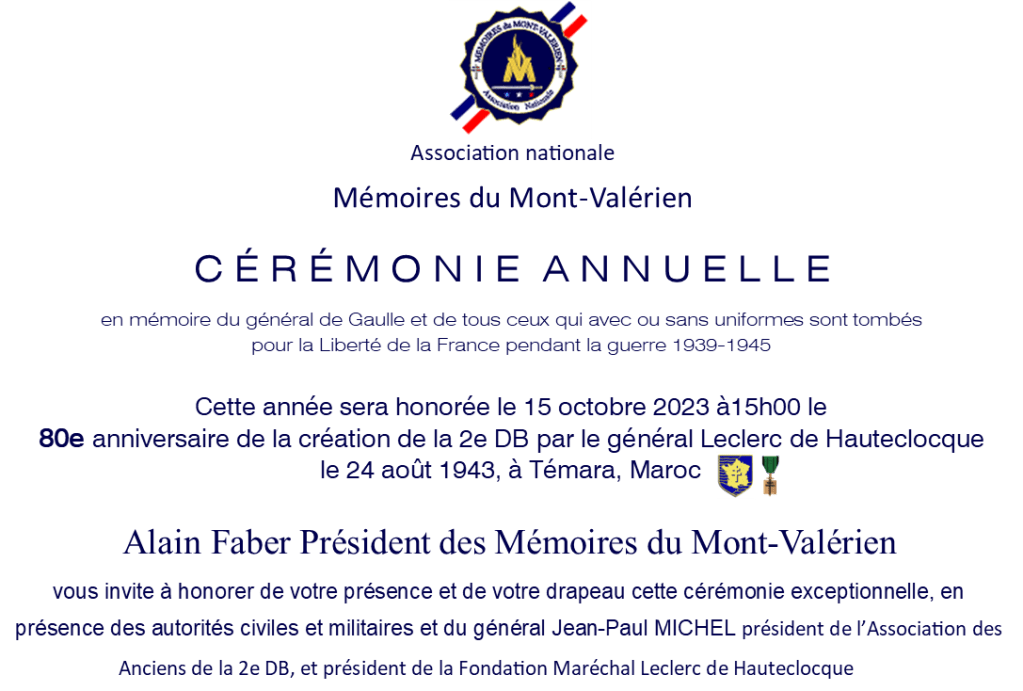 Vous êtes invités à cette cérémonie exceptionnellement dédiée cette année au 80e anniversaire de la création de la 2e DB par le général LECLERC de HAUTECLOCQUE le 24 août 1943 à Témara au Maroc