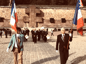 Étaient présents, les musiciens de la fanfare de la ville de Maçon et leurs accompagnateurs, Madame Marie José Genty, vice-présidente de la SMLH de Neuilly-sur-Seine, Alain Joly Président de l’UNADIF et son drapeau, le Colonel Thierry Babette porteur du drapeau de notre association et vice-président francophone du Monument National à la Résistance pour la ville de Liège. Mélanie Durda nous a aimablement assisté pour cette petite cérémonie qui s’est déroulée dans la clairière des fusillés avec cinq roses blanches mises à l’emplacement des poteaux d’exécution puis notre gerbe déposée devant la flamme du Mémorial.
