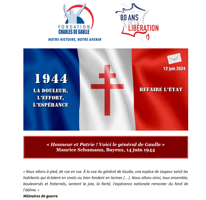 Dans le cadre du partenariat qui nous li avec la Fondation Charles-de-GAULLE nous vous présentons la dernière publication relative au 14 JUIN 1944