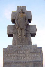 Monument dédié aux forces françaises libres. Sur fond de granit en forme de croix de Lorraine, un Sénan se tient debout.