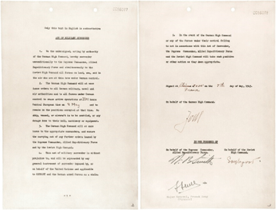 « L’acte de la reddition – Seul le texte anglais qui vaut autorité dactylographié court, élaboré en hâte sous la supervision d’Eisenhower. »