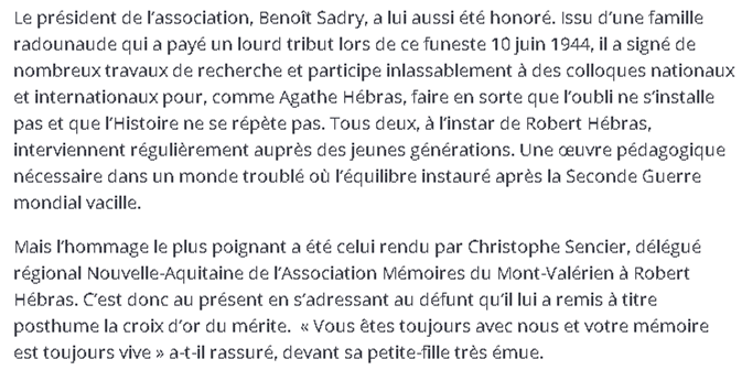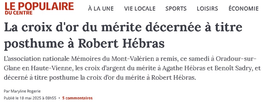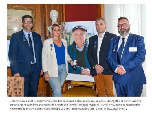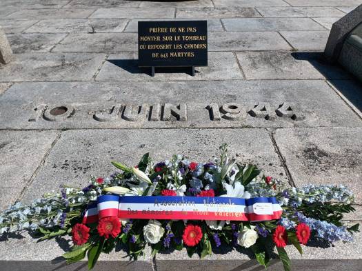 Le 17 mai 2025, à l’occasion de la signature de la « Charte de partenariat » entre la ville d’Oradour-sur-Glane et l’Association Nationale des Mémoires du Mont-Valérien une gerbe fut déposée sur le tombeau ou reposent les cendres des Martyres du 10 juin 1944.