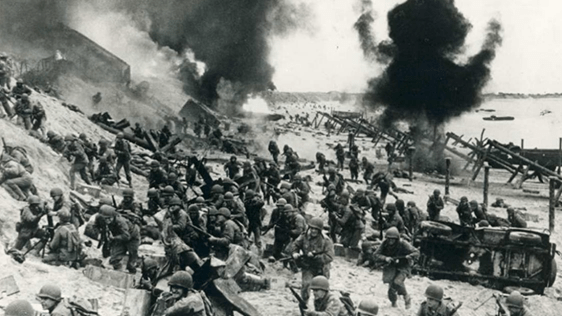 Le 6 juin 1944, 5 divisions convoyées dans près de 4 300 péniches et protégées par près de 500 bâtiments de guerre débarquent au lever du jour sur les 5 plages appelées Utah, Omaha, Gold, Juno et Sword.