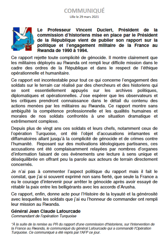 C’est la raison pour laquelle, l’UNC soutient sans réserve l’association France Turquoise qui défend et promeut la mémoire et l’honneur de l’armée française et des militaires français ayant servi au Rwanda et qu’elle vous propose de prendre connaissance du communiqué de son président, le général (2s) Jean-Claude Lafourcade et de le diffuser largement.
