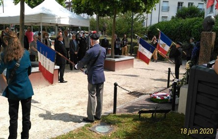 La Commémoration du 80ème Anniversaire de l’Appel à la stèle Charles de Gaulle – Jeudi 18 juin 2020 Cela devait être l’évènement pour notre comité CdG. Rendez-vous compte : L’année des 3 anniversaires De Gaulle , notre choix pour l’Appel avec des moyens exceptionnels mis à notre disposition pour bien marquer cet anniversaire. Presque tout a été dit à ce sujet notamment dans le précédent numéro en page 1 mais convenons qu’il y a de quoi être contrarié pour longtemps. Le rassemblement autour de la stèle a bien eu lieu malgré des règles préfectorales restrictives qui perdurent au plan sanitaire. Ces règles moins contraignantes comme pour le 8 mai où l’effectif autorisé était limité à 5 !! Certains adhérents « à risques » se sont abstenus (on peut les comprendre avec un virus aussi insaisissable dont les scientifiques n’ont toujours pas cerné toutes les caractéristiques). La place a pu accueillir une quarantaine de fidèles, masqués ou se tenant à distance recommandée. Comme d’habitude barnum et sièges avaient été prévus par la municipalité. Ambiance recueillie mais moins conviviale, plus réservée sans les marques d’amitié des poignées de mains et des embrassades. Il faut espérer qu’une vie plus normale sera possible dans les meilleurs délais. Notre bureau vise un « rattrapage » pour le dimanches 8 novembre pour marquer le dernier anniversaire de l’année De Gaulle